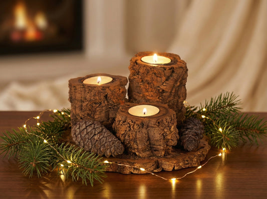 Para quem gosta de oferecer gestos com significado, criámos pequenas peças em madeira recuperada — árvores, suportes de vela e outros mimos feitos à mão. São objetos simples, naturais e cheios de encanto, perfeitos para trazer aconchego nesta época. Cada detalhe é único — porque a natureza nunca repete!