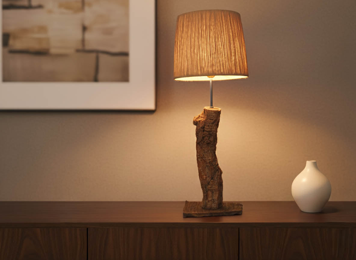 A base em madeira, moldada pelo tempo e transformada artesanalmente, é limpa, lixada, tratada contra insetos e fungos e tapa poros antes de receber um acabamento suave com cera de abelha natural, preservando as marcas, rachas e imperfeições que contam a sua história. O abajur, por sua vez, nasce de uma estrutura de arame moldada e soldada manualmente, à qual se entrelaça, fibra a fibra, a ráfia de papel — formando um desenho único de sombra e luz.