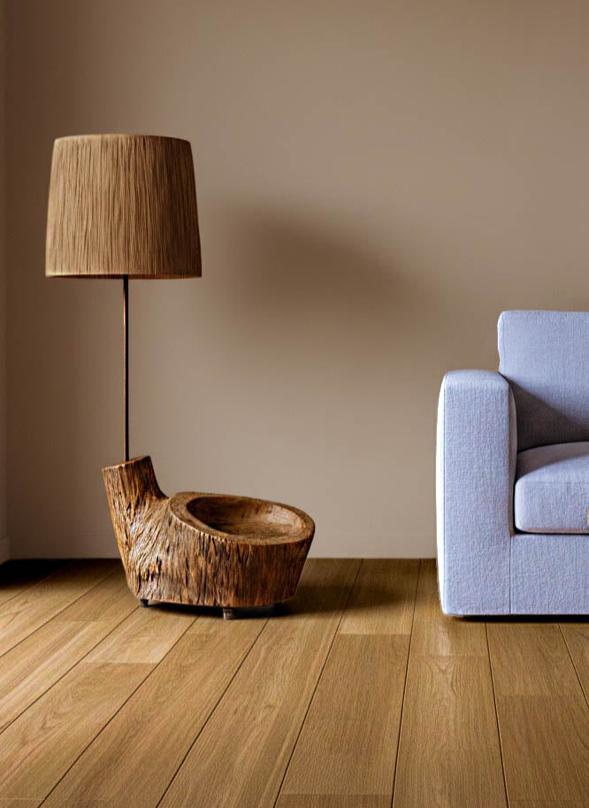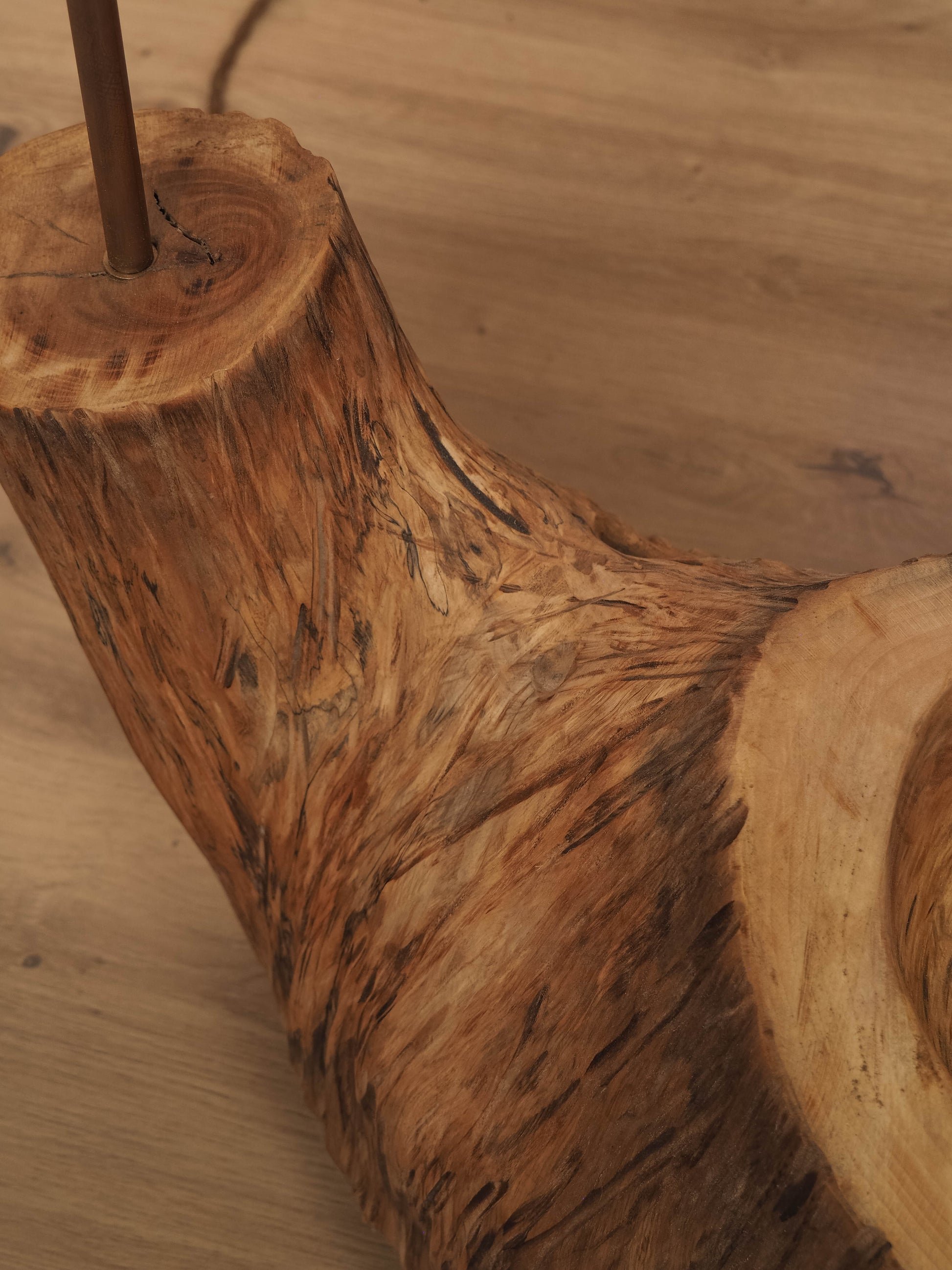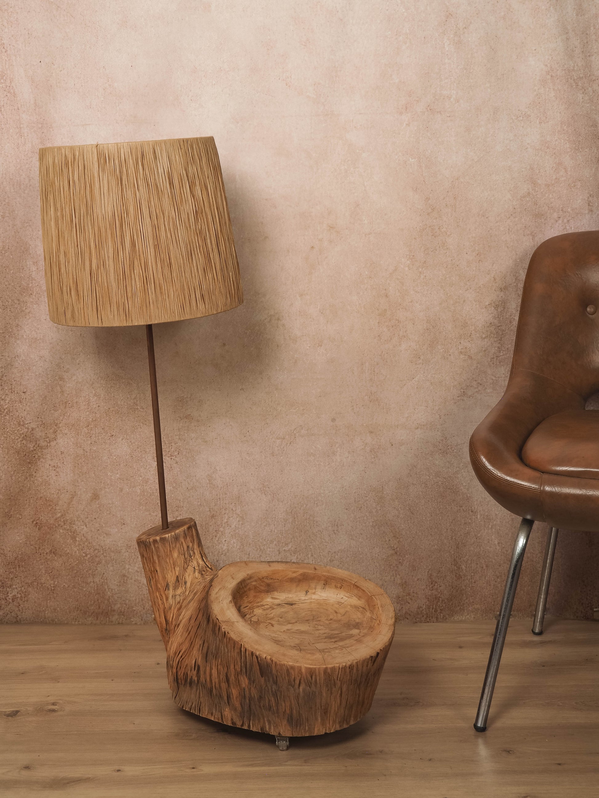 A base em madeira, moldada pelo tempo e transformada artesanalmente, é limpa, lixada, tratada contra insetos e fungos e tapa poros antes de receber um acabamento suave com cera de abelha natural, preservando as marcas, rachas e imperfeições que contam a sua história. O abajur, por sua vez, nasce de uma estrutura de arame moldada e soldada manualmente, à qual se entrelaça, fibra a fibra, a ráfia de papel — formando um desenho único de sombra e luz.
