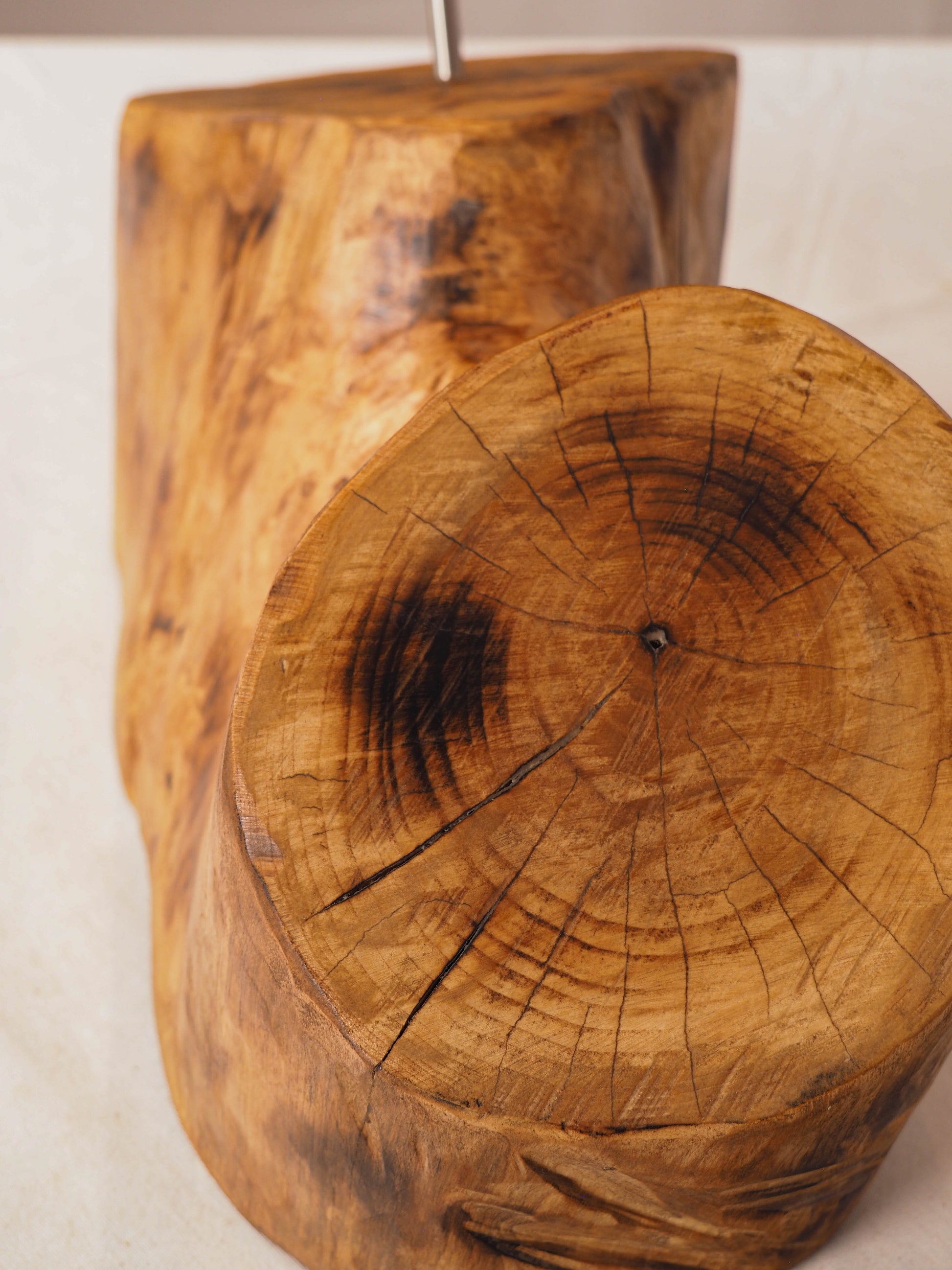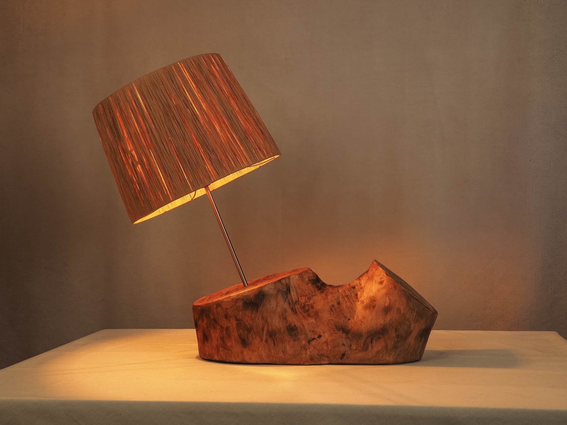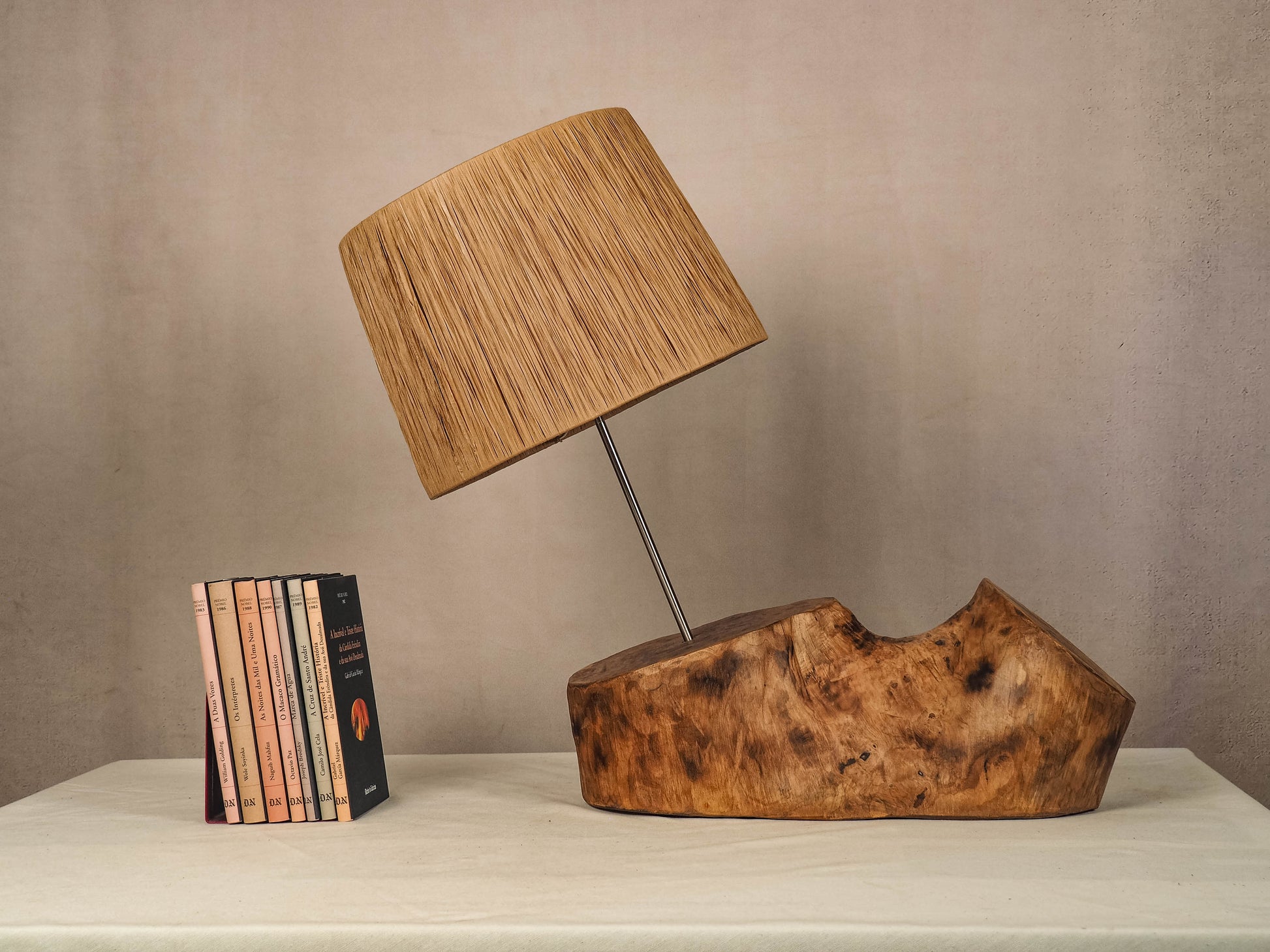 A base em madeira, moldada pelo tempo e transformada artesanalmente, é limpa, lixada, tratada contra insetos e fungos e tapa poros antes de receber um acabamento suave com cera de abelha natural, preservando as marcas, rachas e imperfeições que contam a sua história. O abajur, por sua vez, nasce de uma estrutura de arame moldada e soldada manualmente, à qual se entrelaça, fibra a fibra, a ráfia de papel — formando um desenho único de sombra e luz.