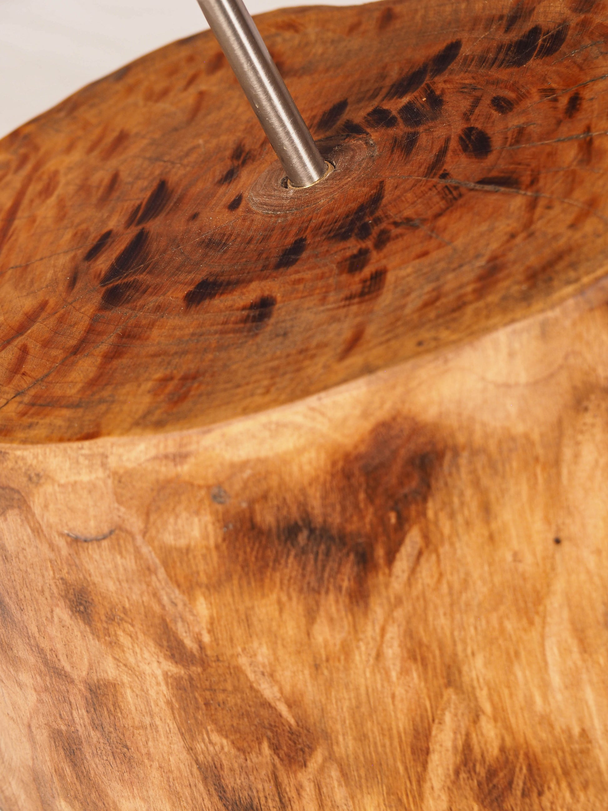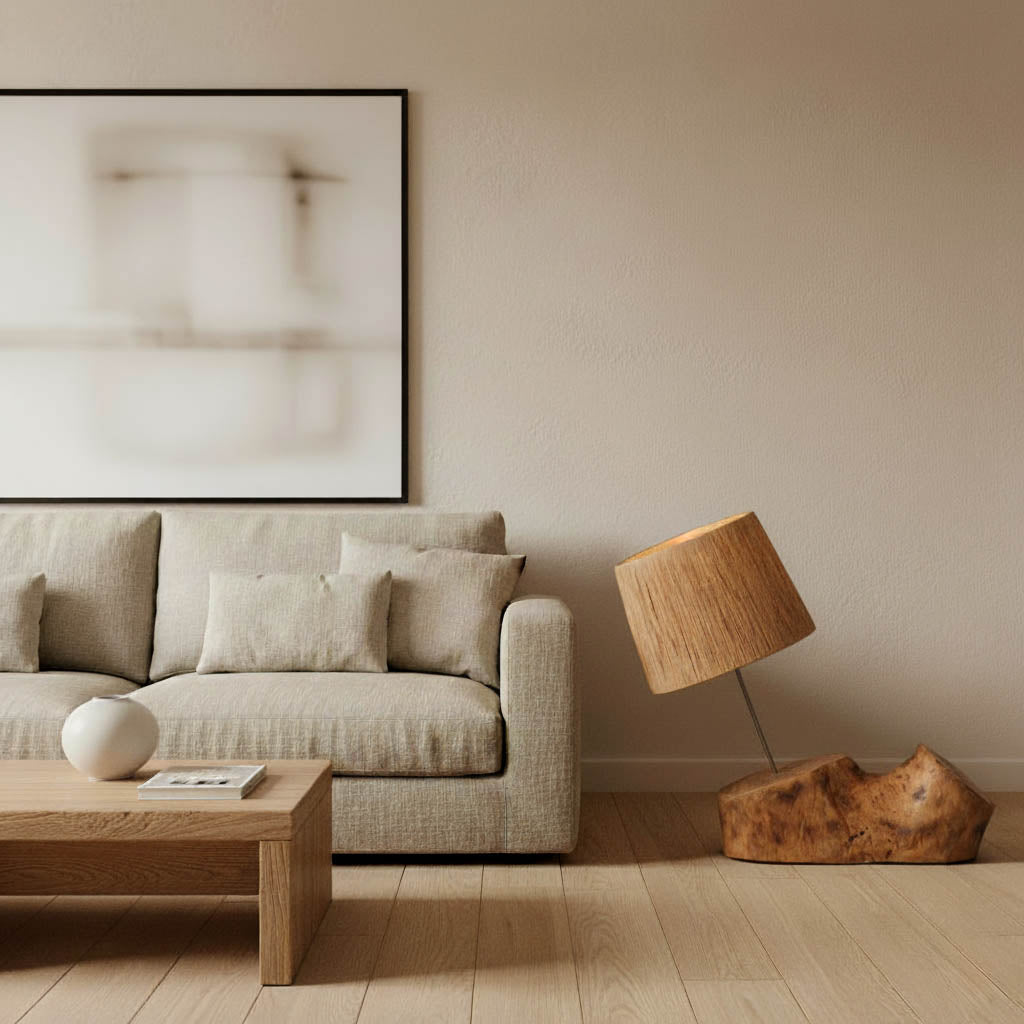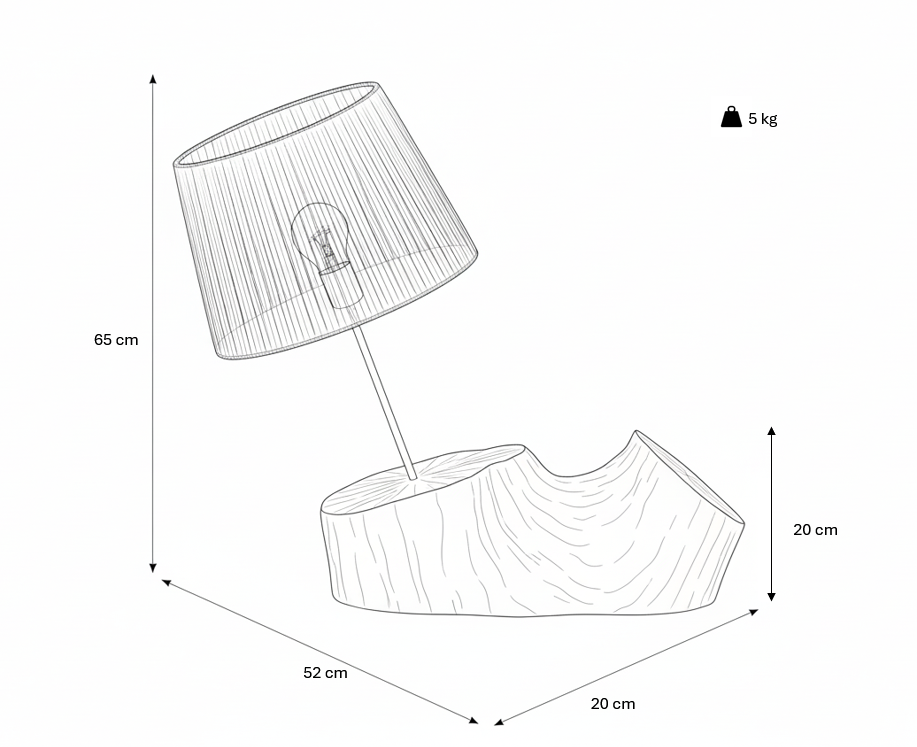 A base em madeira, moldada pelo tempo e transformada artesanalmente, é limpa, lixada, tratada contra insetos e fungos e tapa poros antes de receber um acabamento suave com cera de abelha natural, preservando as marcas, rachas e imperfeições que contam a sua história. O abajur, por sua vez, nasce de uma estrutura de arame moldada e soldada manualmente, à qual se entrelaça, fibra a fibra, a ráfia de papel — formando um desenho único de sombra e luz.