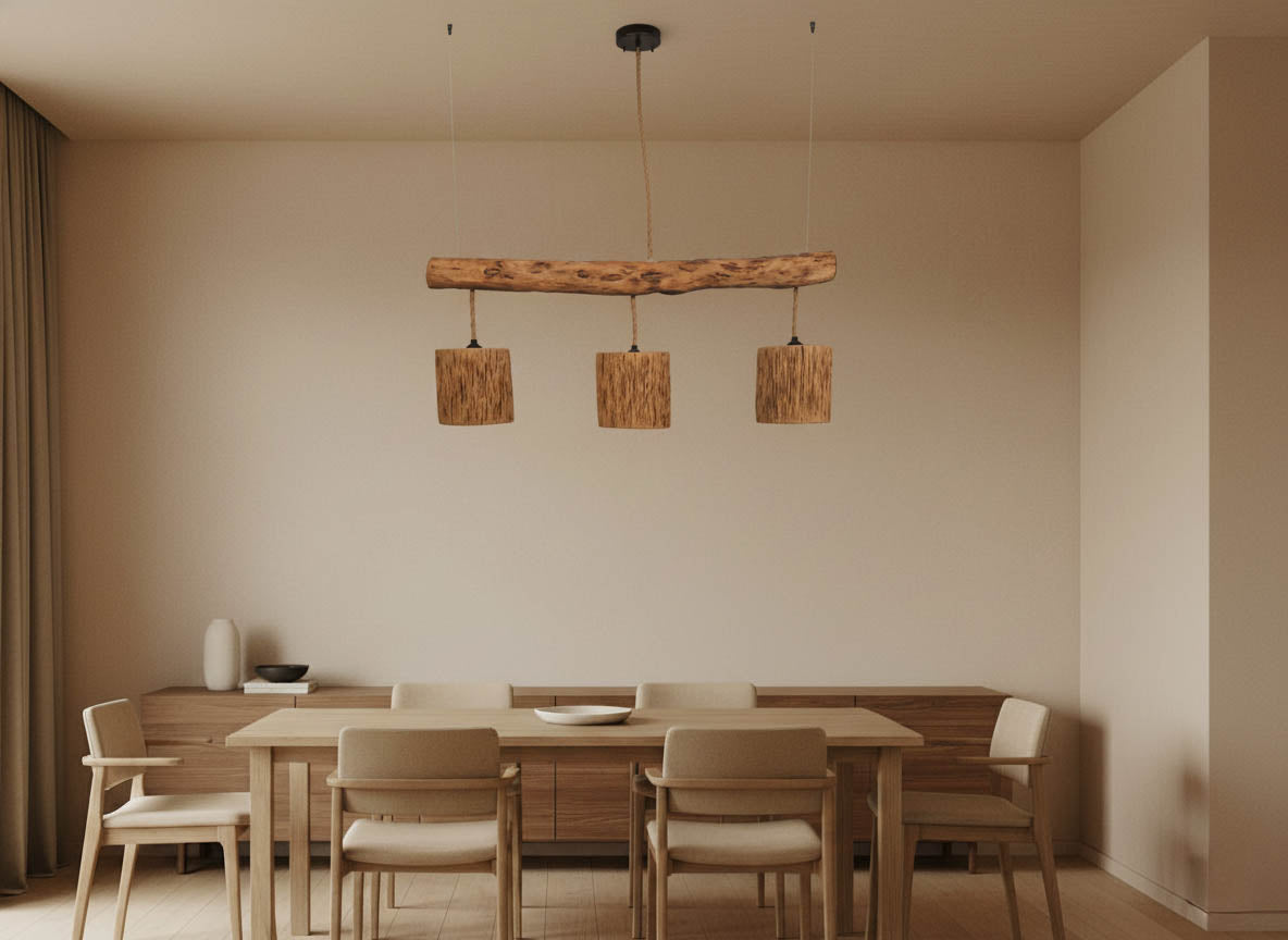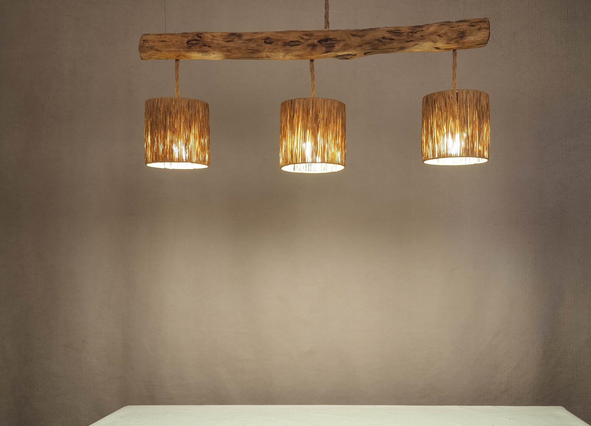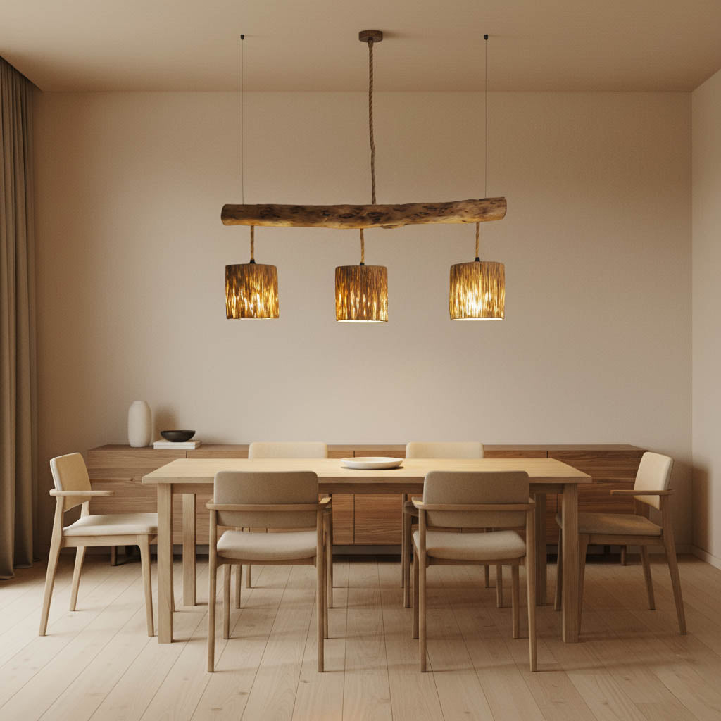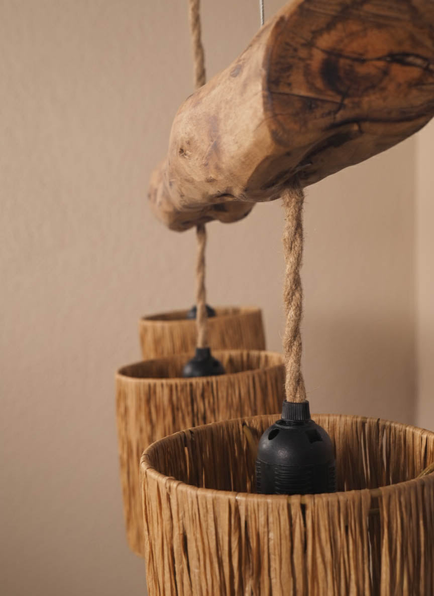 Inspirado na força serena da floresta, ESTEIO é um candeeiro suspenso que combina robustez e leveza. Um tronco de madeira, com veios marcados, flutua elegantemente no teto através de cabos de aço quase invisíveis. Dele descem três abajures em ráfia, que evocam casulos naturais e difundem uma luz âmbar, suave e acolhedora. O ESTEIO é uma peça artesanal que transforma refeições e encontros em momentos de intimidade e autenticidade.