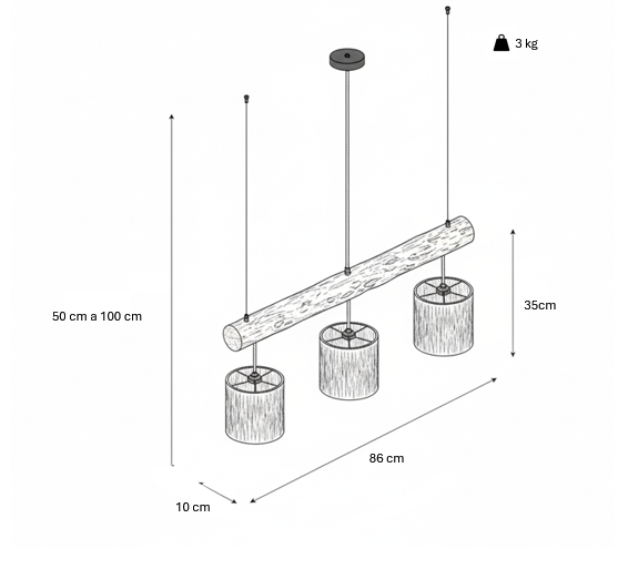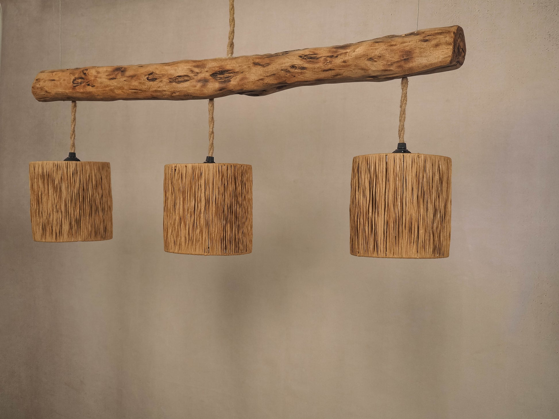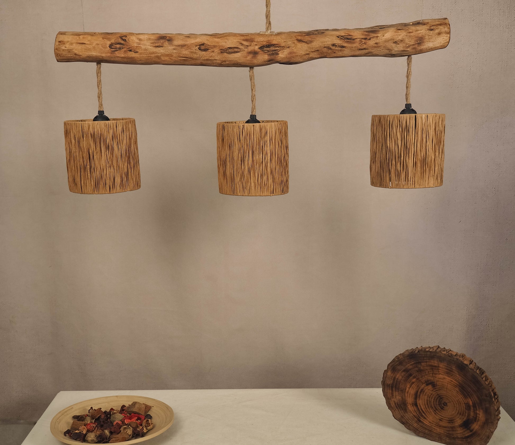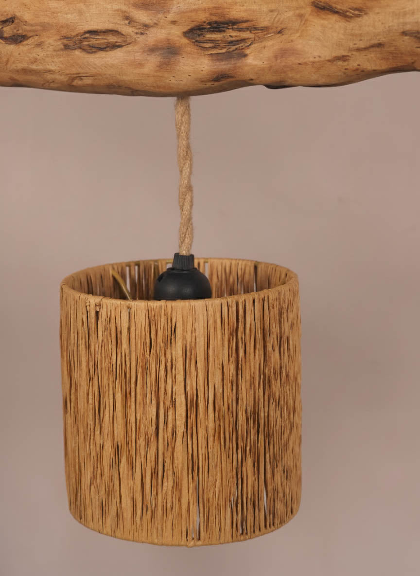 Inspirado na força serena da floresta, ESTEIO é um candeeiro suspenso que combina robustez e leveza. Um tronco de madeira, com veios marcados, flutua elegantemente no teto através de cabos de aço quase invisíveis. Dele descem três abajures em ráfia, que evocam casulos naturais e difundem uma luz âmbar, suave e acolhedora. O ESTEIO é uma peça artesanal que transforma refeições e encontros em momentos de intimidade e autenticidade.