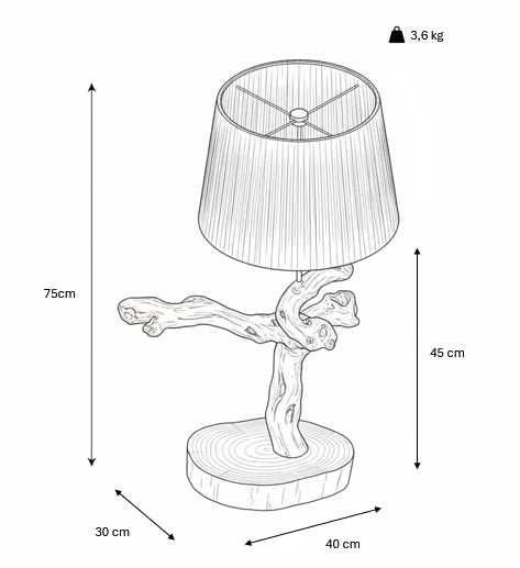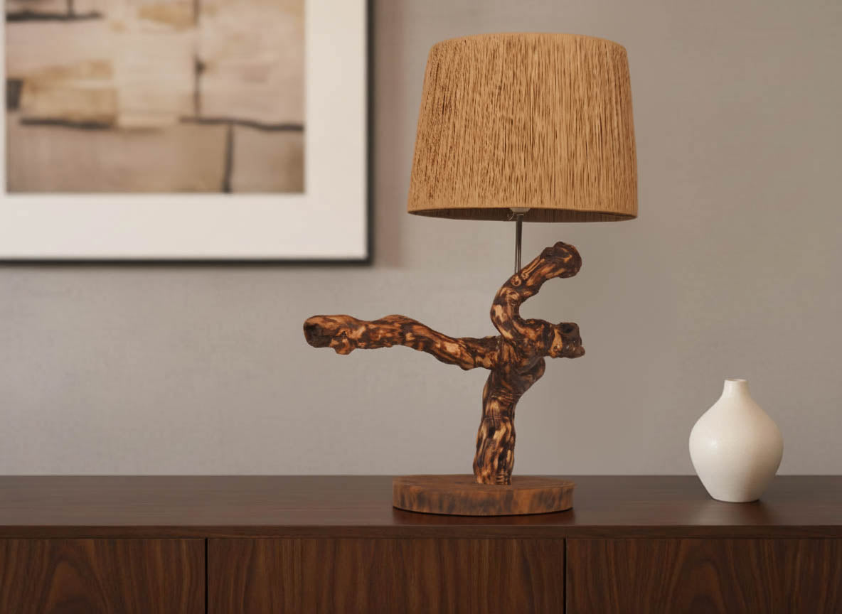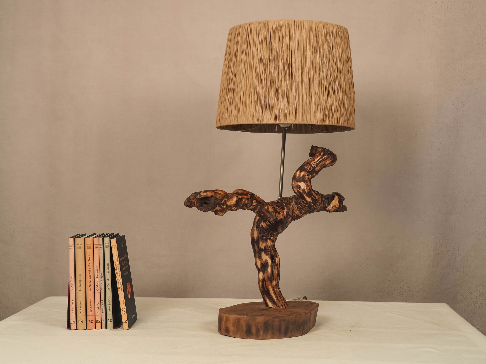 A base em madeira, moldada pelo tempo e transformada artesanalmente, é limpa, lixada, tratada contra insetos e fungos e tapa poros antes de receber um acabamento suave com cera de abelha natural, preservando as marcas, rachas e imperfeições que contam a sua história. O abajur, por sua vez, nasce de uma estrutura de arame moldada e soldada manualmente, à qual se entrelaça, fibra a fibra, a ráfia de papel — formando um desenho único de sombra e luz.
