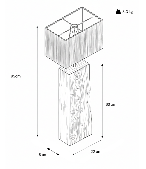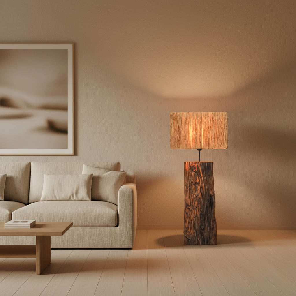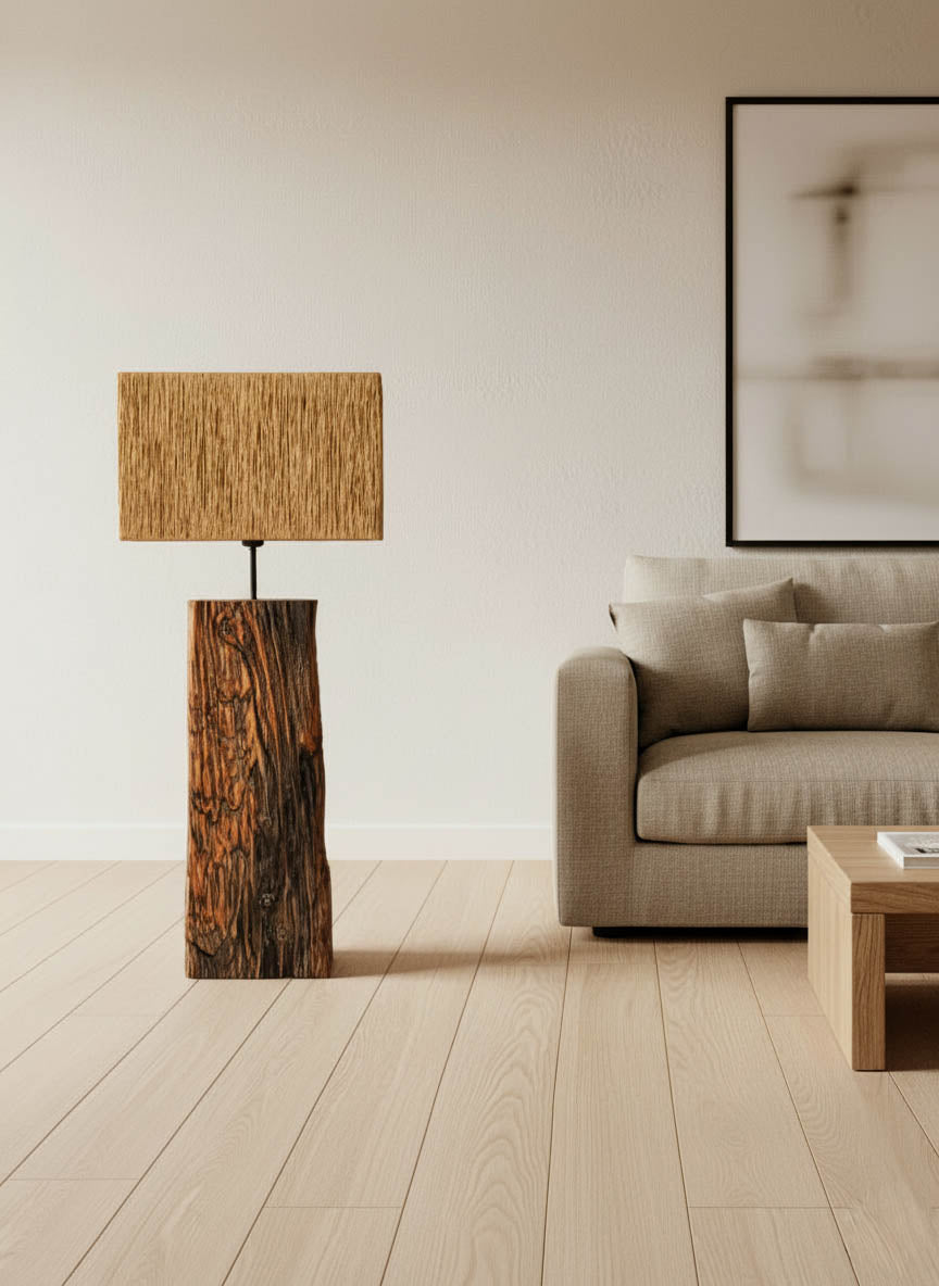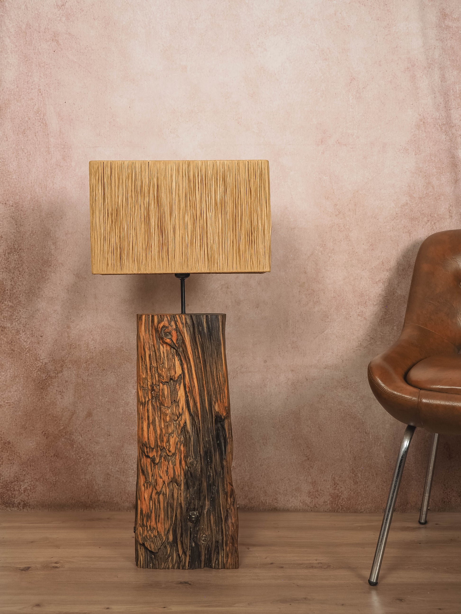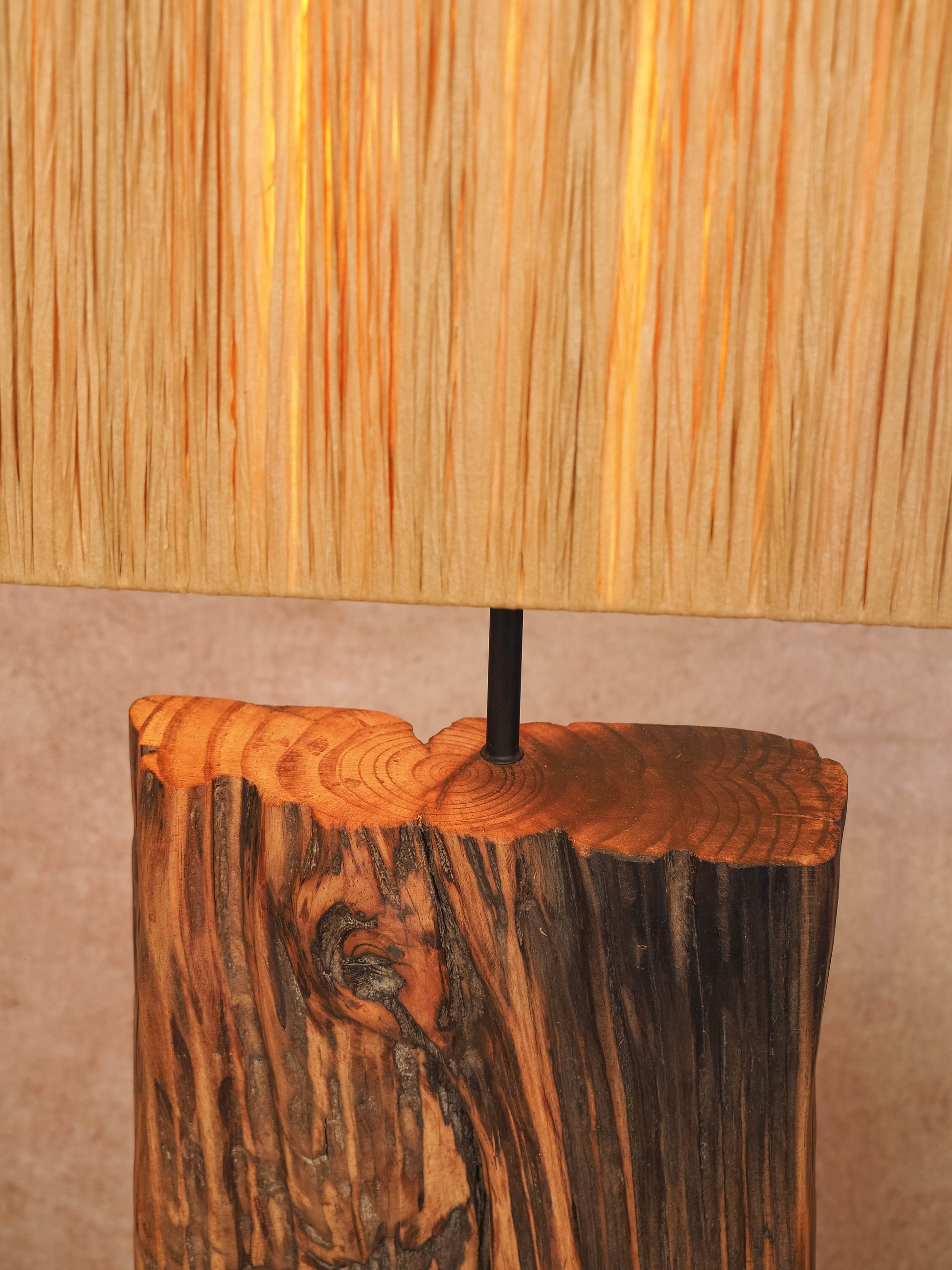 A base em madeira, moldada pelo tempo e transformada artesanalmente, é limpa, lixada, tratada contra insetos e fungos e tapa poros antes de receber um acabamento suave com cera de abelha natural, preservando as marcas, rachas e imperfeições que contam a sua história. O abajur, por sua vez, nasce de uma estrutura de arame moldada e soldada manualmente, à qual se entrelaça, fibra a fibra, a ráfia de papel — formando um desenho único de sombra e luz.