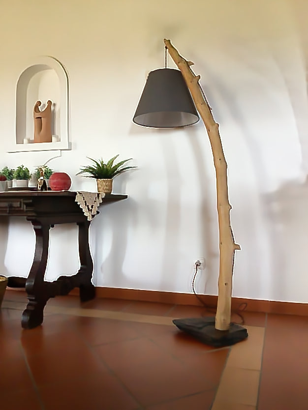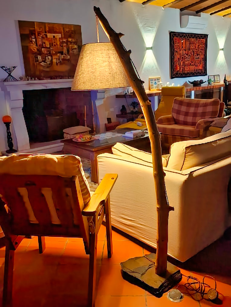 Pinus conjuga autenticidade e design: ramo de pinheiro arqueado sustém o abat-jour, enquanto a base de xisto lhe dá a verticalidade e carácter. A luz íntima envolve o espaço, criando um ponto focal que conta histórias de campo e acrescenta calor boémio a qualquer ambiente.