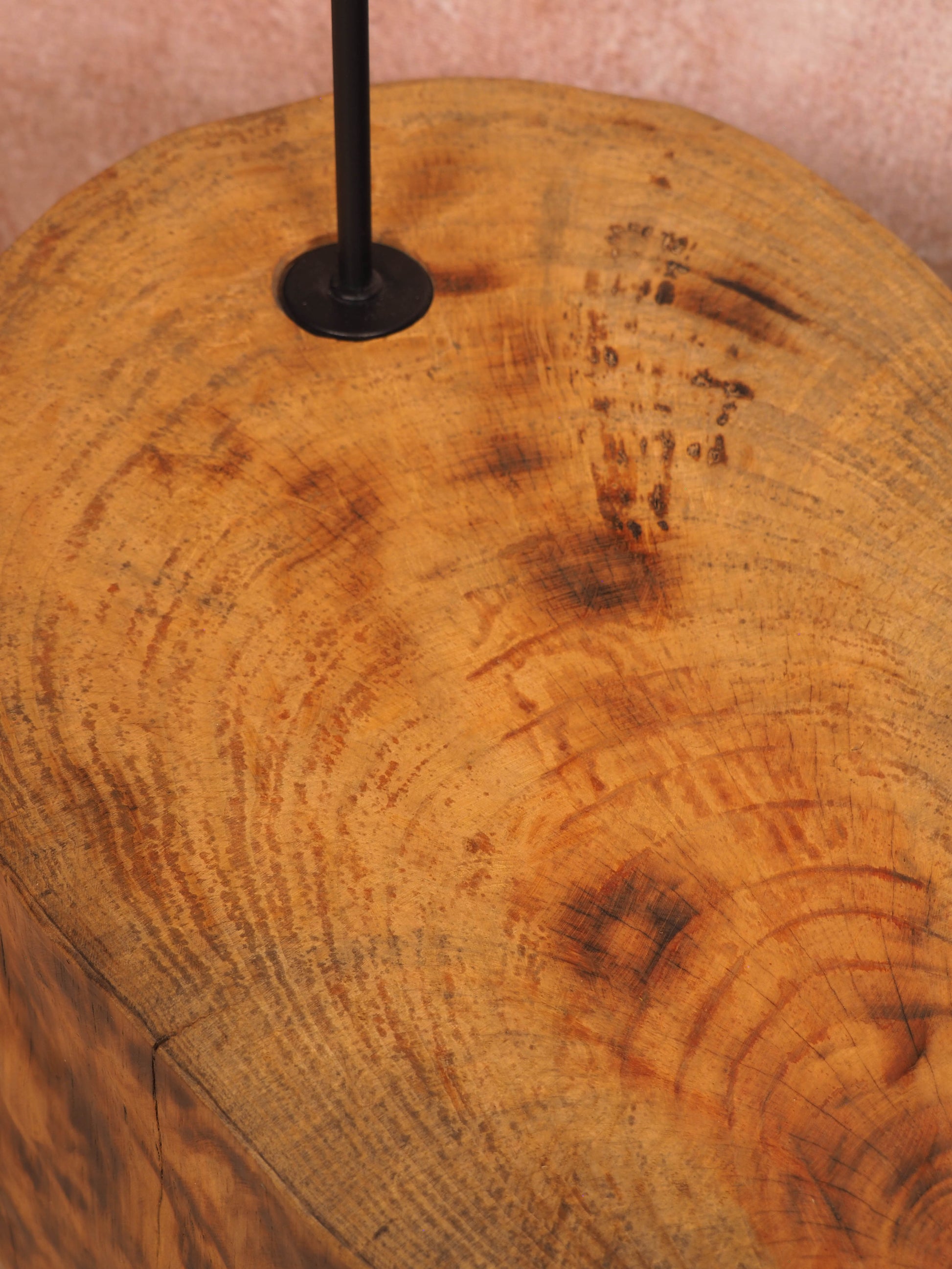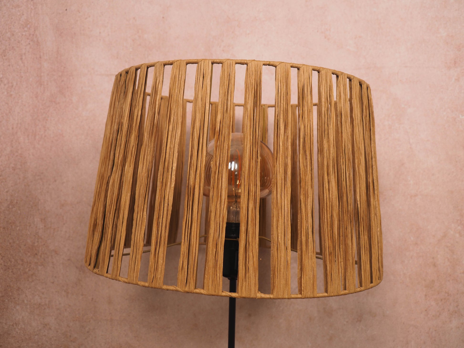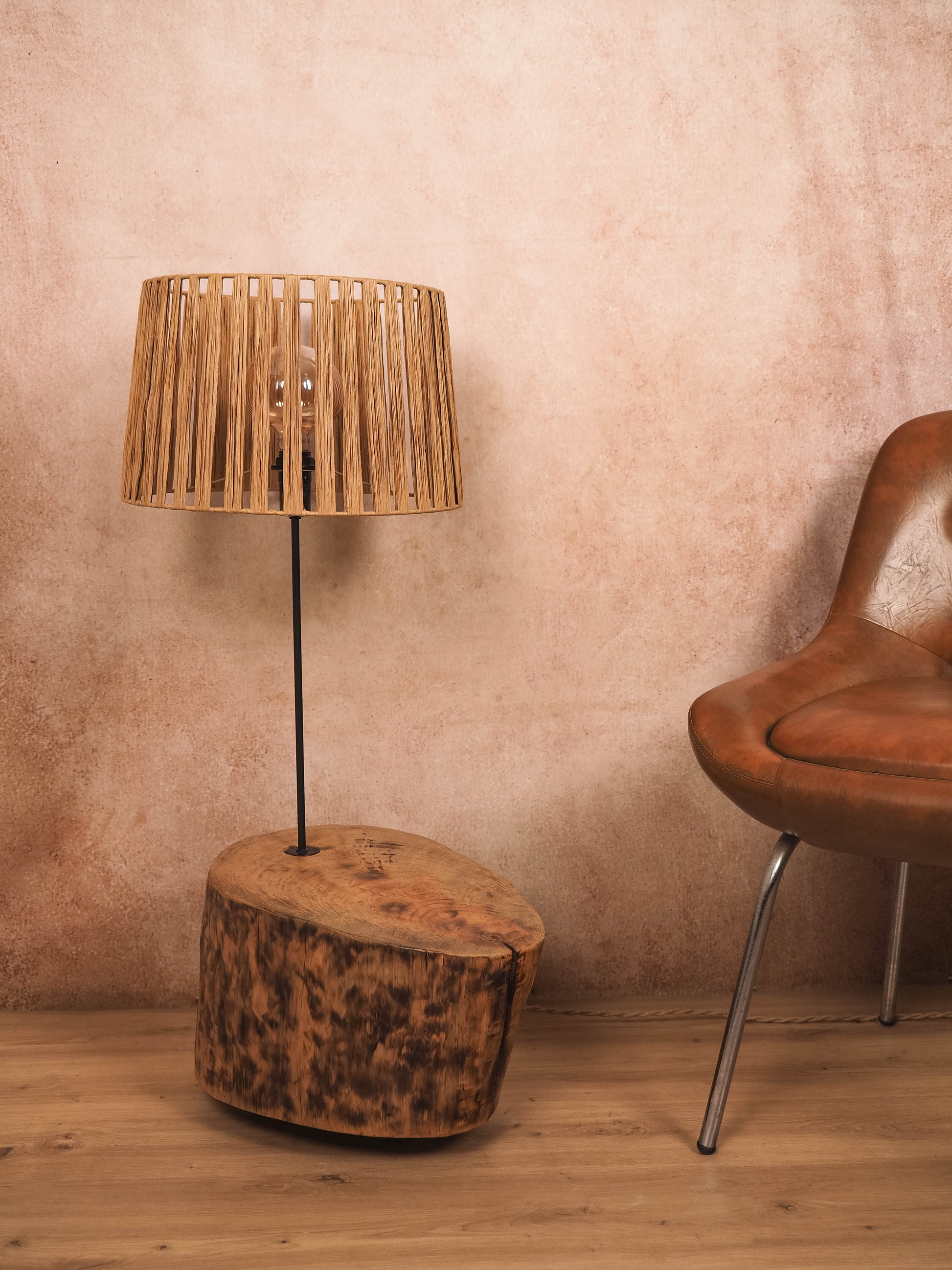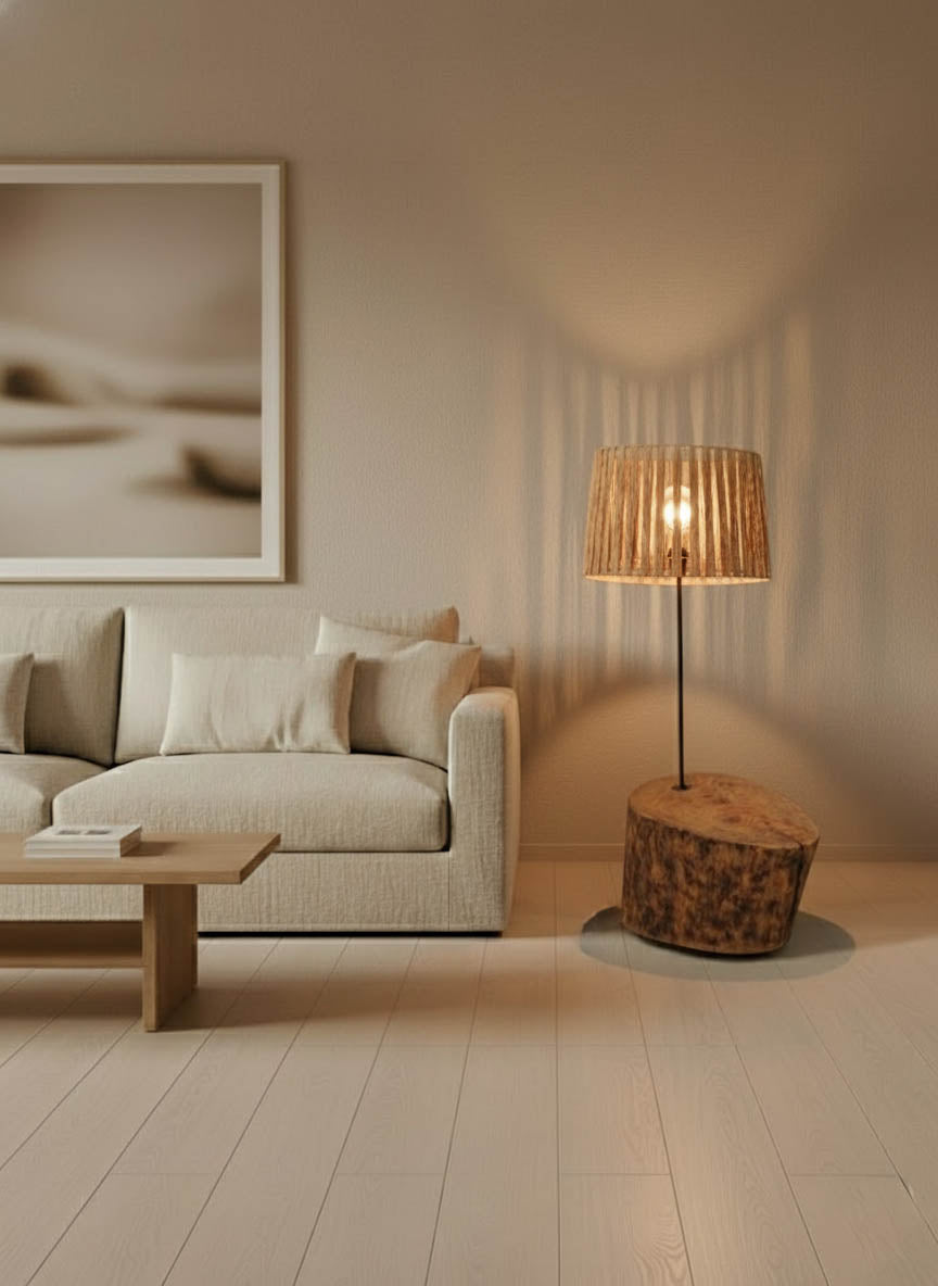 A base em madeira, moldada pelo tempo e transformada artesanalmente, é limpa, lixada, tratada contra insetos e fungos e tapa poros antes de receber um acabamento suave com cera de abelha natural, preservando as marcas, rachas e imperfeições que contam a sua história. O abajur, por sua vez, nasce de uma estrutura de arame moldada e soldada manualmente, à qual se entrelaça, fibra a fibra, a ráfia de papel — formando um desenho único de sombra e luz.