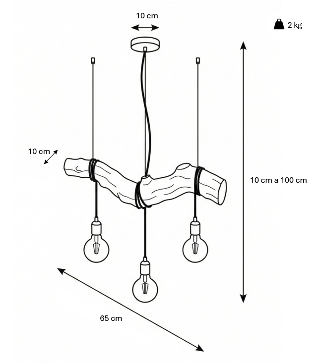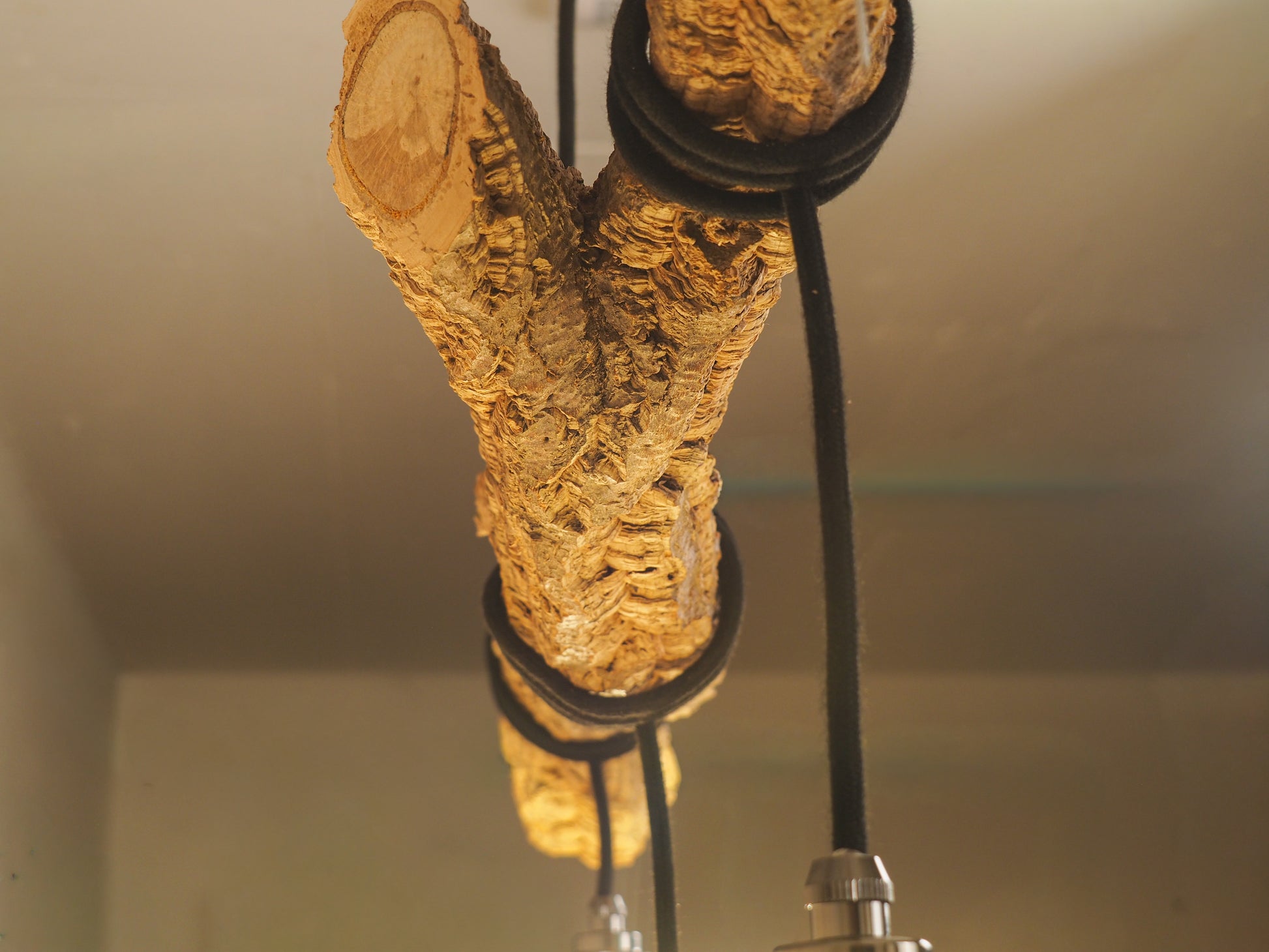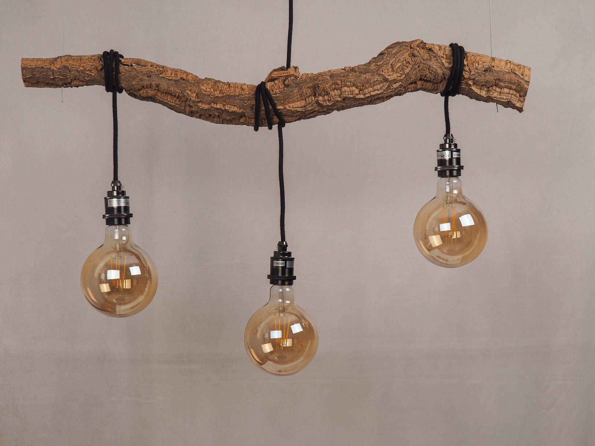 Três lâmpadas de LED suspensas descem de forma desalinhada. Antes de cair, o fio envolve o tronco, criando voltas intencionais que introduzem ritmo, tensão e movimento. Nada é excessivamente alinhado ou simétrico. A luz encontra o seu caminho de forma natural.