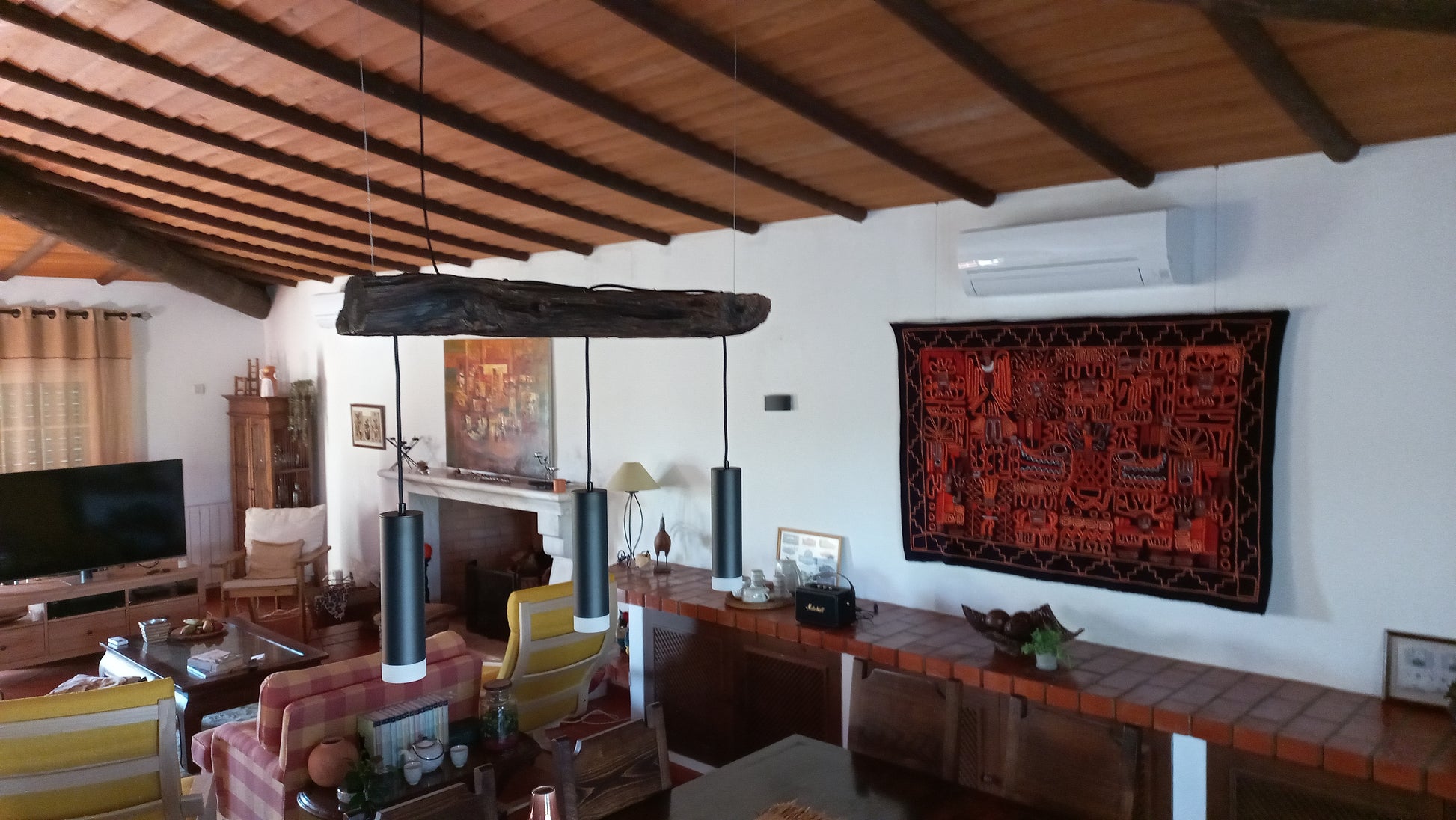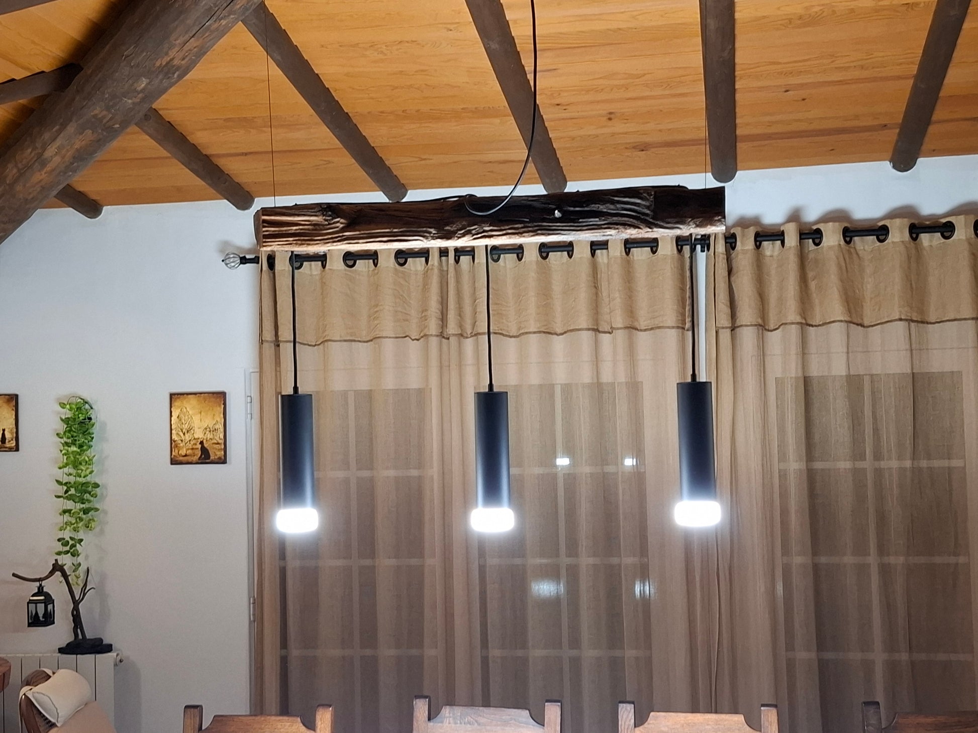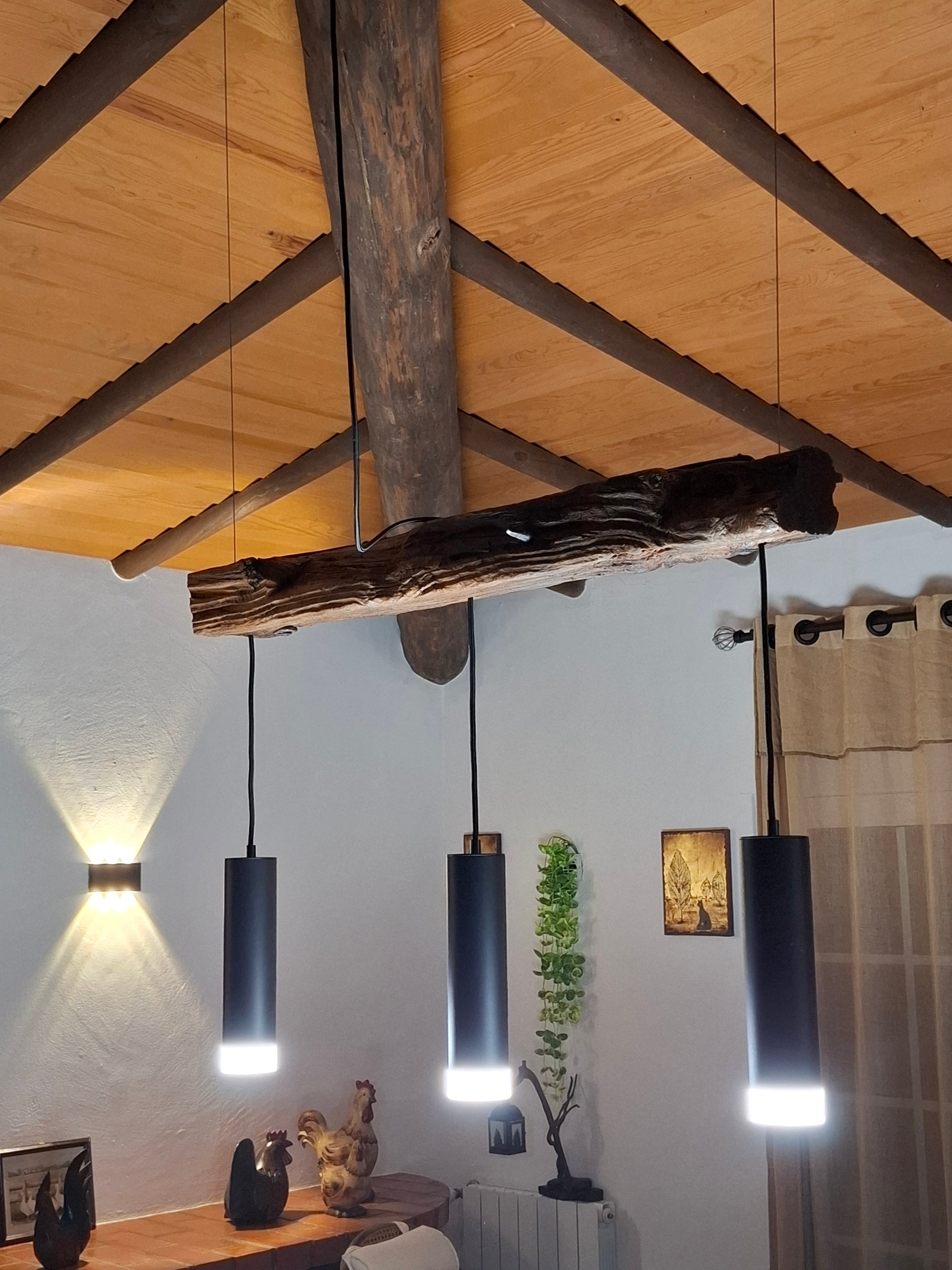 Espetacular candeeiro suspenso criado a partir de uma antiga trave de caminho-de-ferro. A madeira centenária, escurecida pelo tempo, sustenta três pendentes cilíndricos em metal preto com LED de luz quente, iluminando a mesa e projetando reflexos no teto. Peça única que funde história industrial, charme rústico e design contemporâneo, perfeita para casas de campo ou lofts urbanos.
