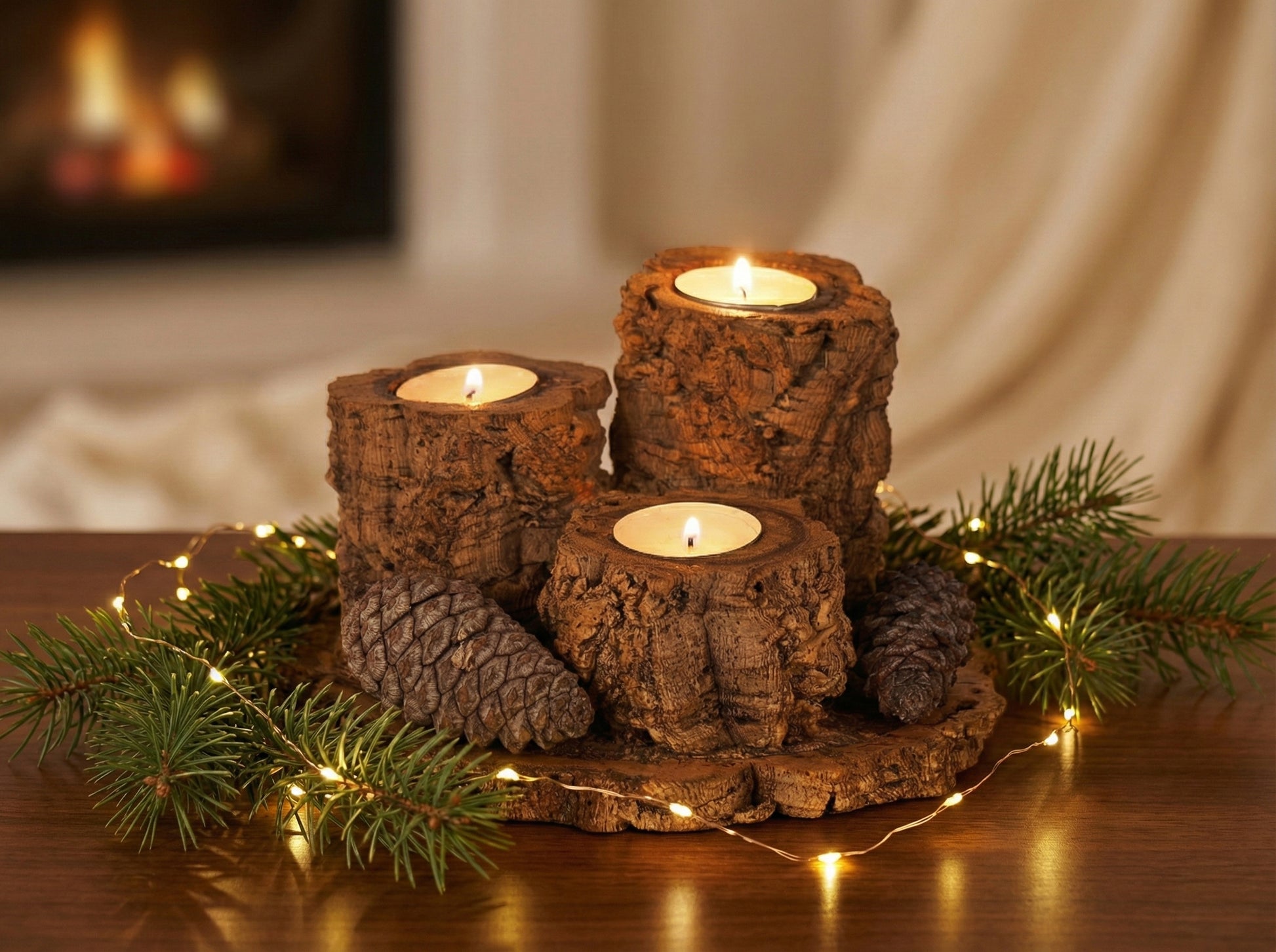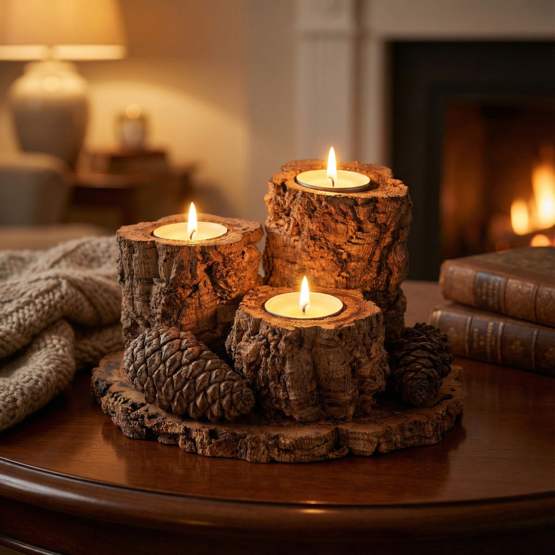 A luz surge próxima da matéria, baixa e quente, reforçando a sensação de enraizamento e tranquilidade. Cada vela encontra abrigo na densidade natural do sobreiro, transformando o conjunto numa presença discreta, mas profundamente acolhedora.