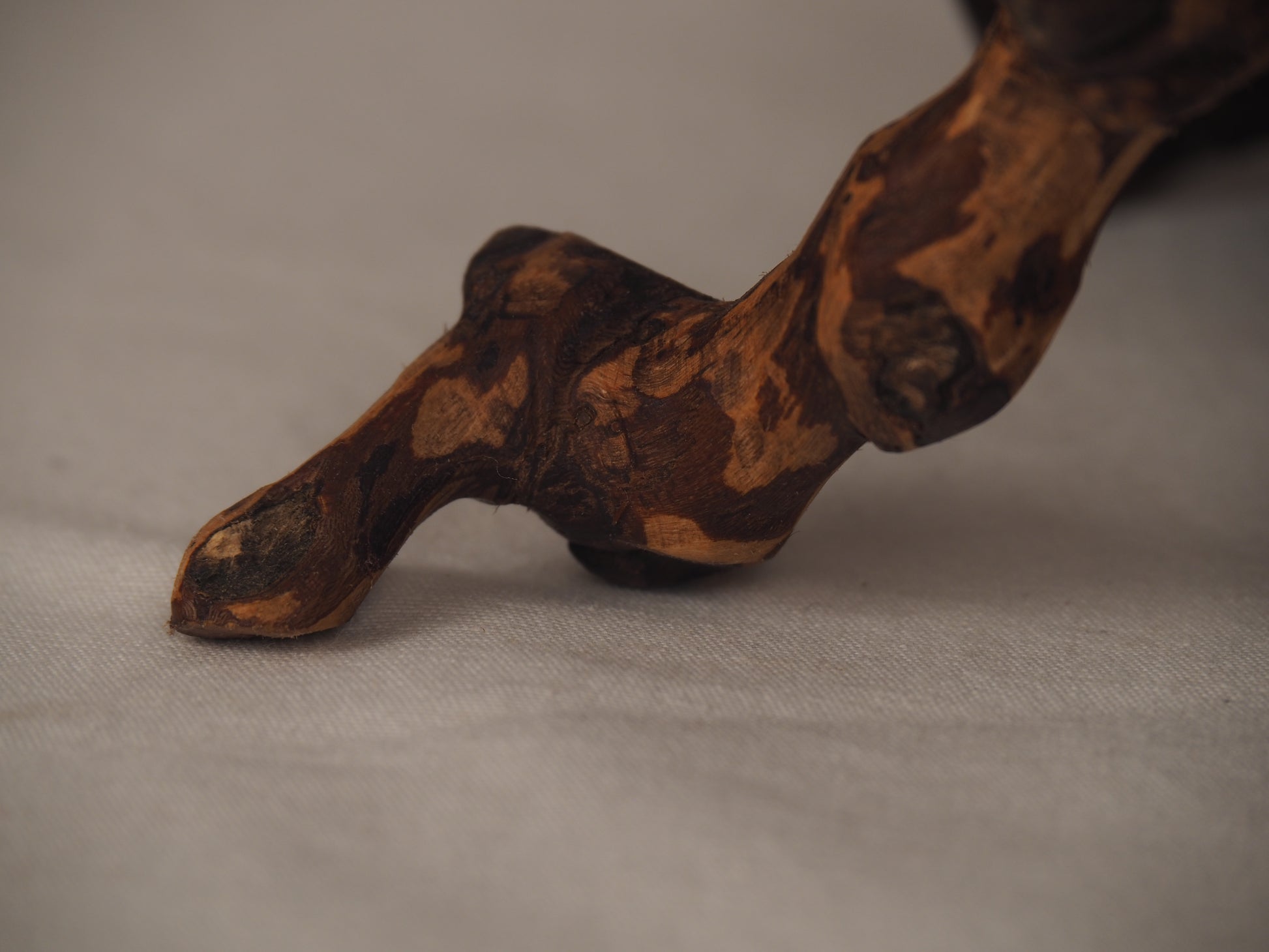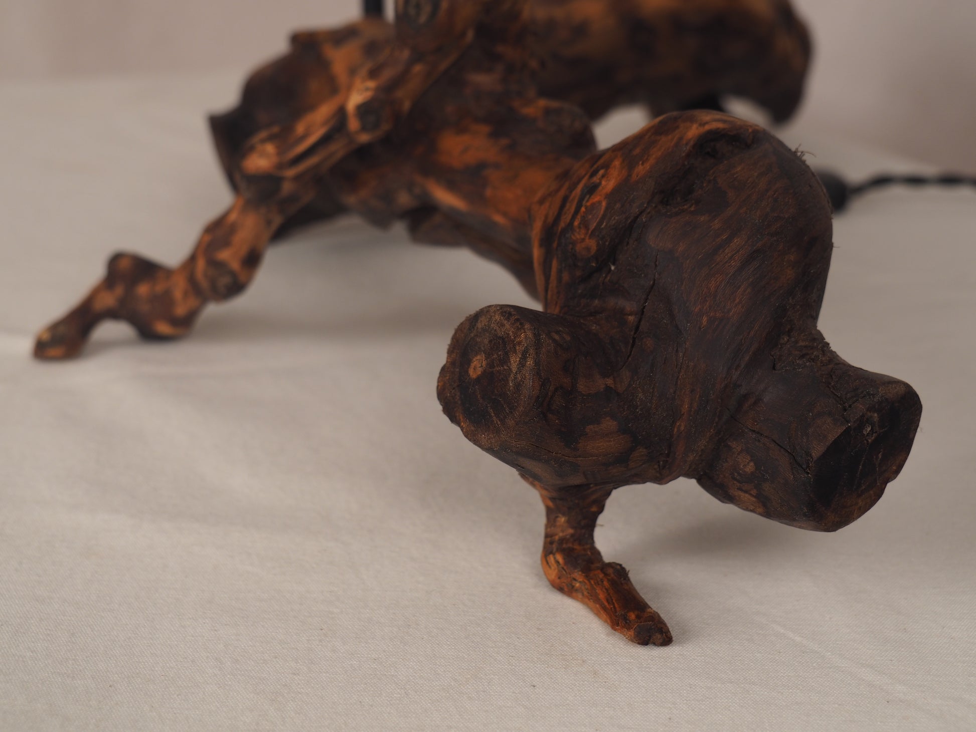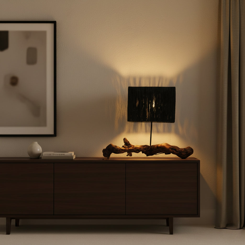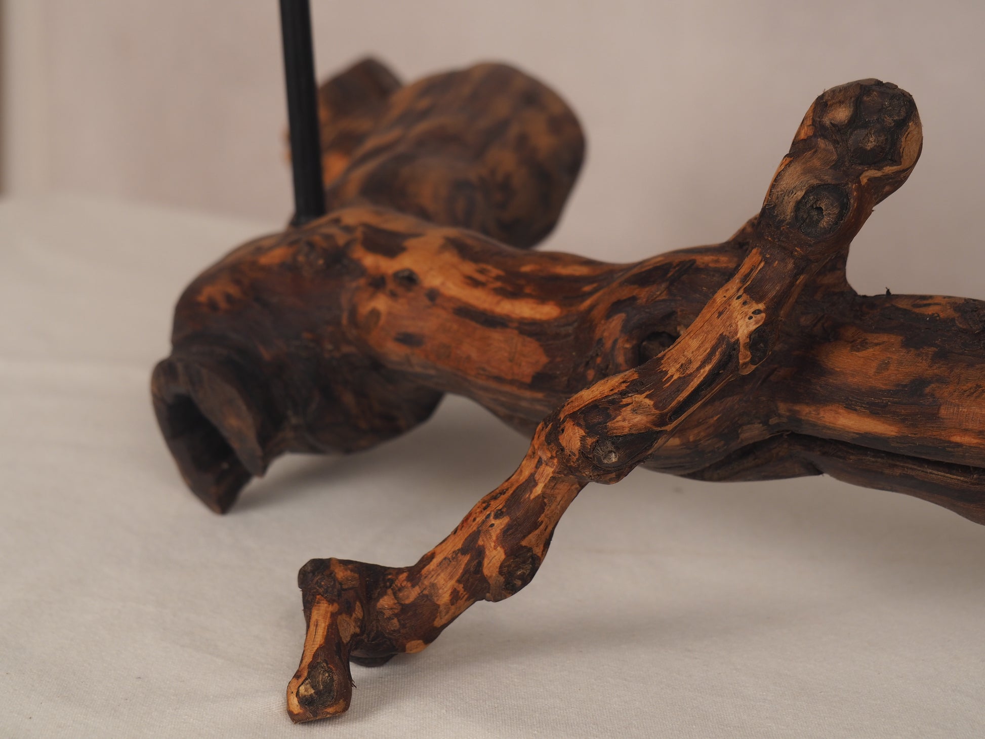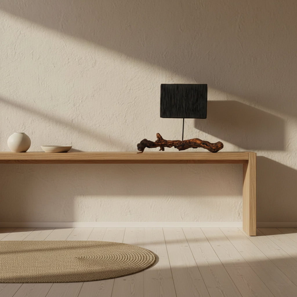 A base orgânica sustenta uma presença serena e escultórica, onde a madeira fala mais alto do que o gesto técnico. Cada fissura, cada curva e cada marca do tempo contam uma história silenciosa, agora iluminada com suavidade.